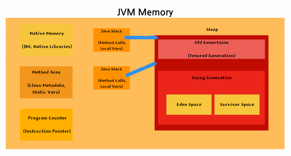 자바 애플리케이션이 실행될 때, JVM(Java Virtual Machine)은 다양한 메모리 영역을 할당하여 객체를 저장하고 관리합니다. 주요 메모리 영역은 다음과 같습니다
