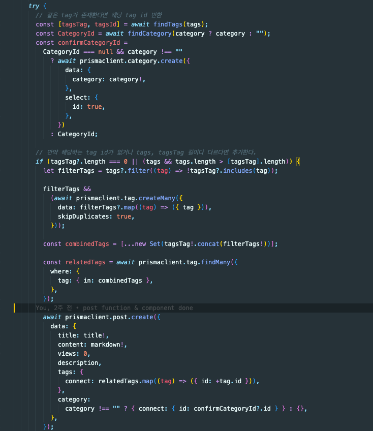 카테고리와는 다르게 태그는 여러 개를 입력받을 수 있고 그 안에서 존재하고 있던 태그, 없던 태그를 구분하고 연동 및 생성하고 연동하는데 프리즈마에 익숙하지 않고 경우의 수가 너무 많아서 어지러웠지만 필요한 기능들을 하나씩 나눠서 해결하니까 결국 해결되었다.